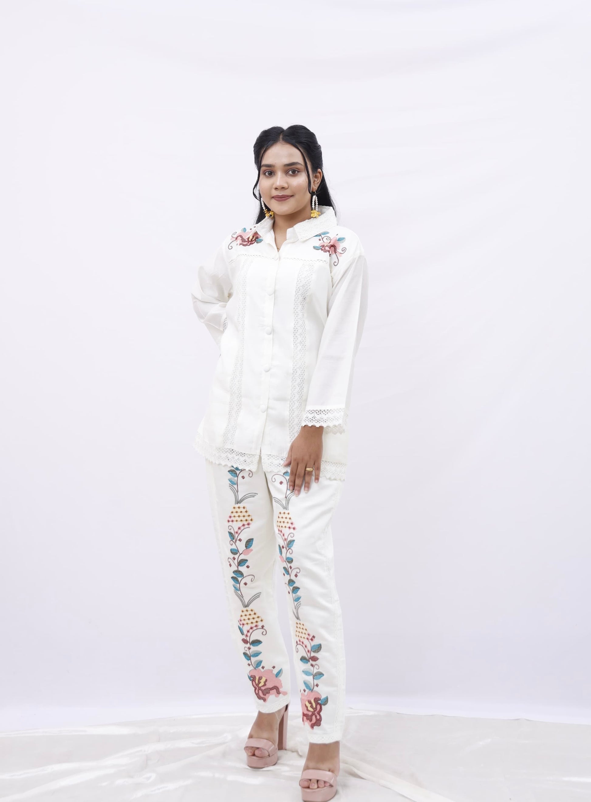 Elevate your everyday elegance with this ivory co-ord set, blending modern minimalism with artistic detail. The collared top features delicate lace accents and intricate embroidery on the shoulders, offering a chic fusion of comfort and sophistication. Paired with straight-fit pants that showcase bold, multicolored floral embroidery, this set is a statement in itself.