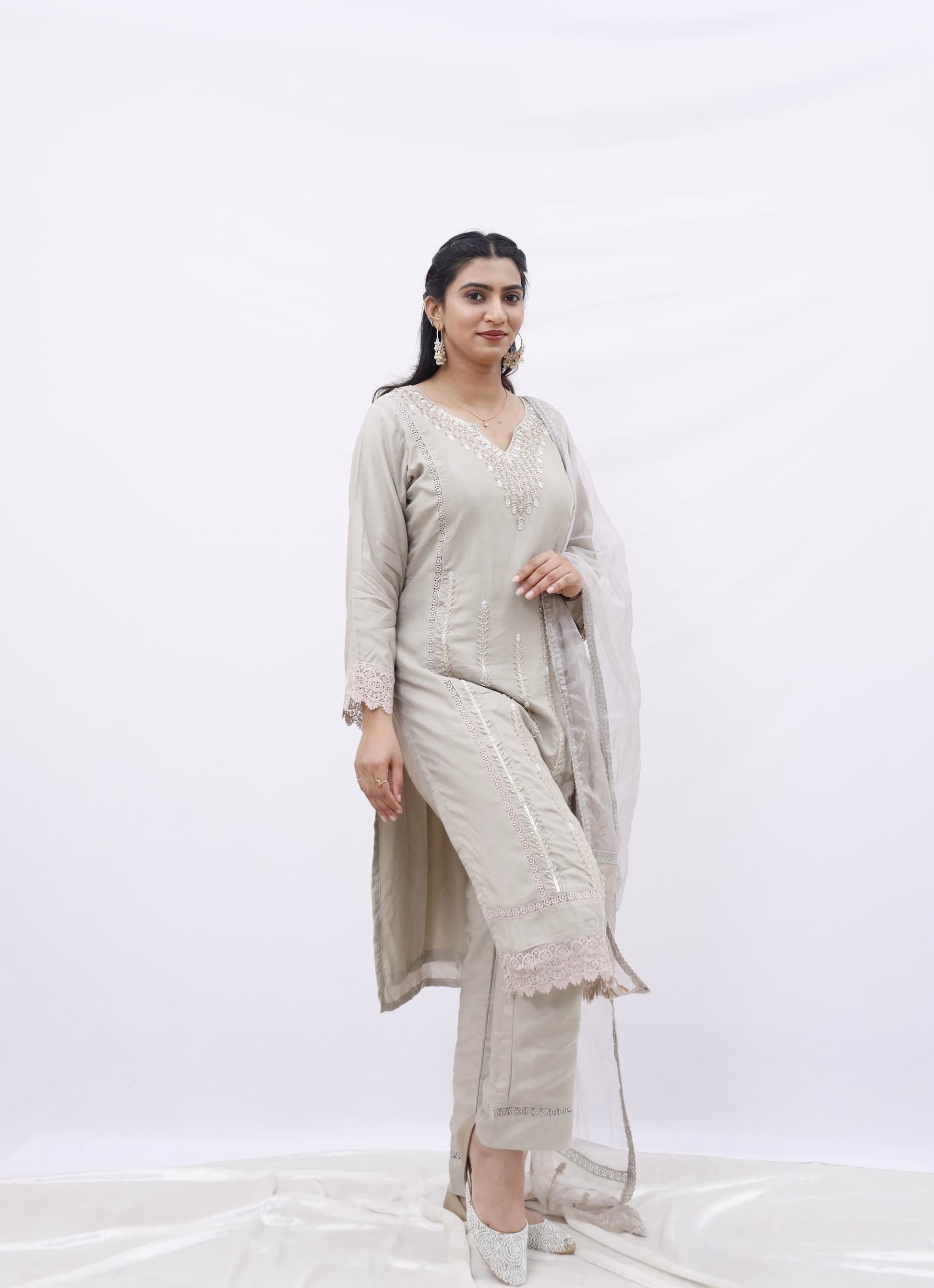 Elevate your elegance with this sophisticated champagne-toned suit set, beautifully embellished with subtle thread and mirror work. The long kurta features vertical embroidered panels and lace borders, giving it a graceful, elongating silhouette. Paired with matching straight pants and a soft net dupatta featuring embroidered detailing, this ensemble is your go-to for refined festivities and family gatherings.