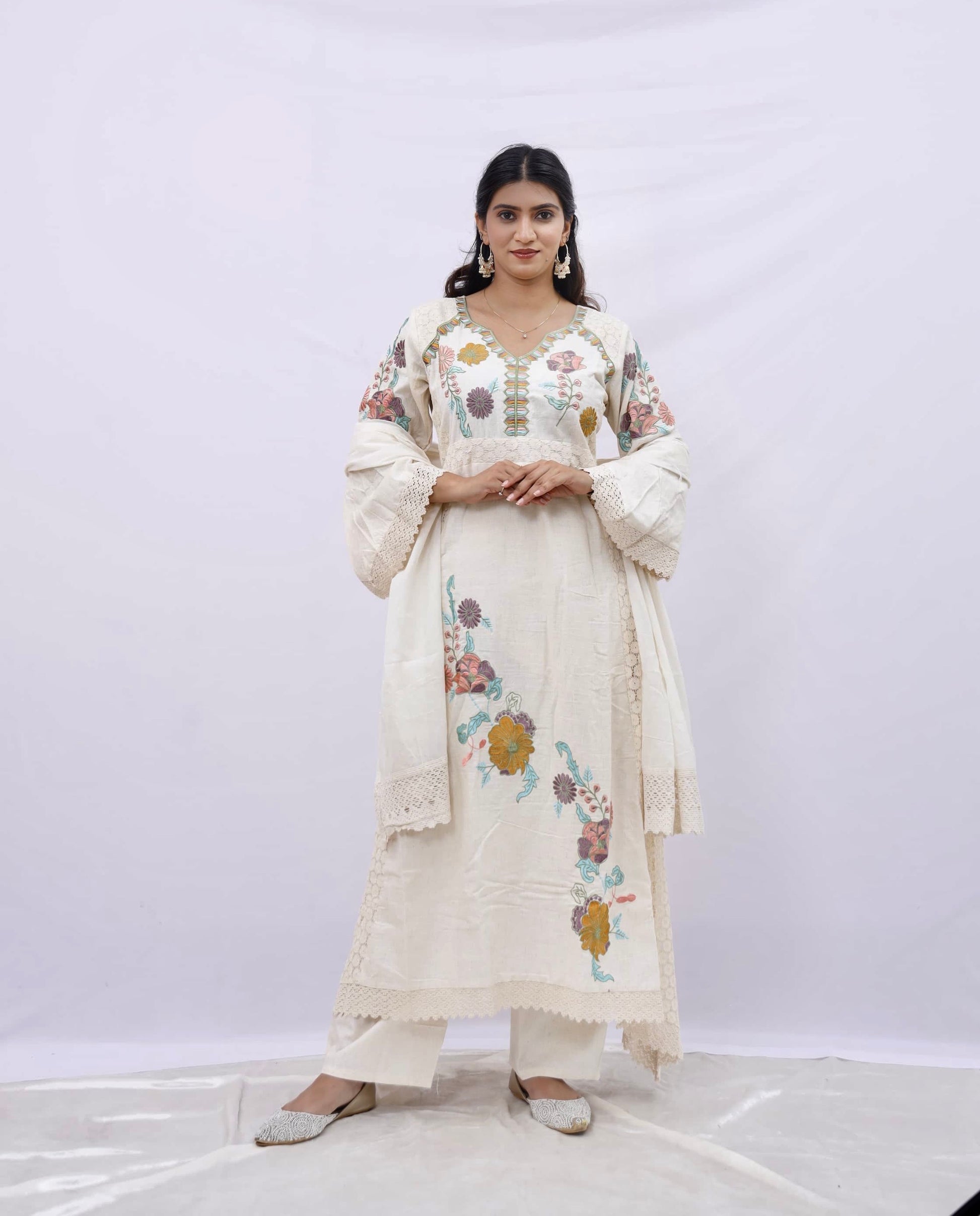Grace your everyday or festive wardrobe with our Ivory Garden Embroidered Kurta Set, a timeless blend of subtle sophistication and artisanal beauty. Crafted in a soft, breathable fabric, this three-piece ensemble features a flared kurta adorned with multicolored floral embroidery on the front, sleeves, and side panels. The bell sleeves and scalloped lace detailing along the edges add an extra dash of elegance. It is paired with straight-fit ivory pants and a matching dupatta with delicate lace trims, creating a look that’s effortlessly graceful.