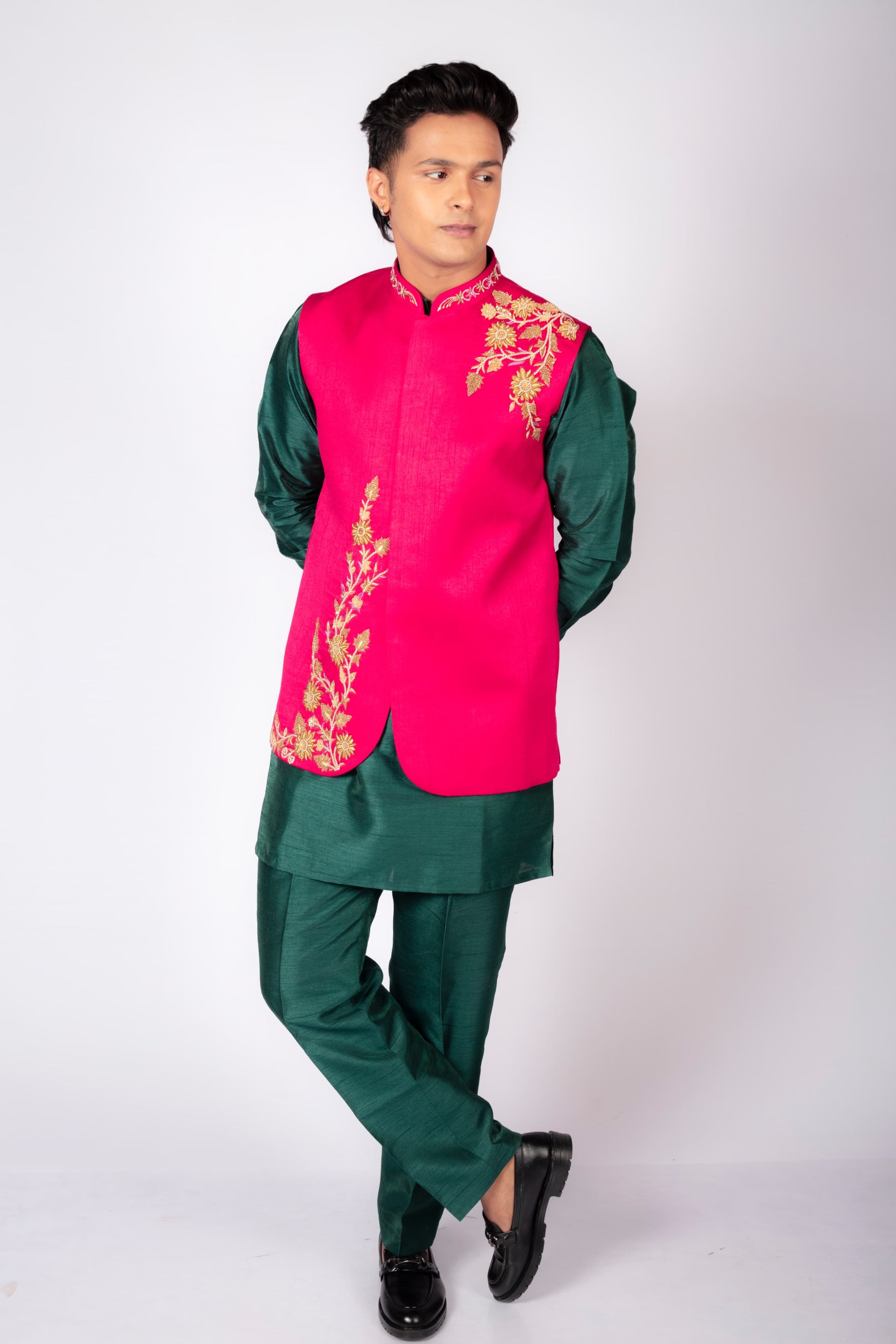 Make a bold and elegant statement this festive season with our stunning men's kurta set. This ensemble features a deep emerald green silk kurta and churidar pants, crafted with a rich texture that exudes sophistication. The highlight is the vibrant fuchsia pink Nehru jacket, adorned with intricate golden floral embroidery that adds a regal touch.