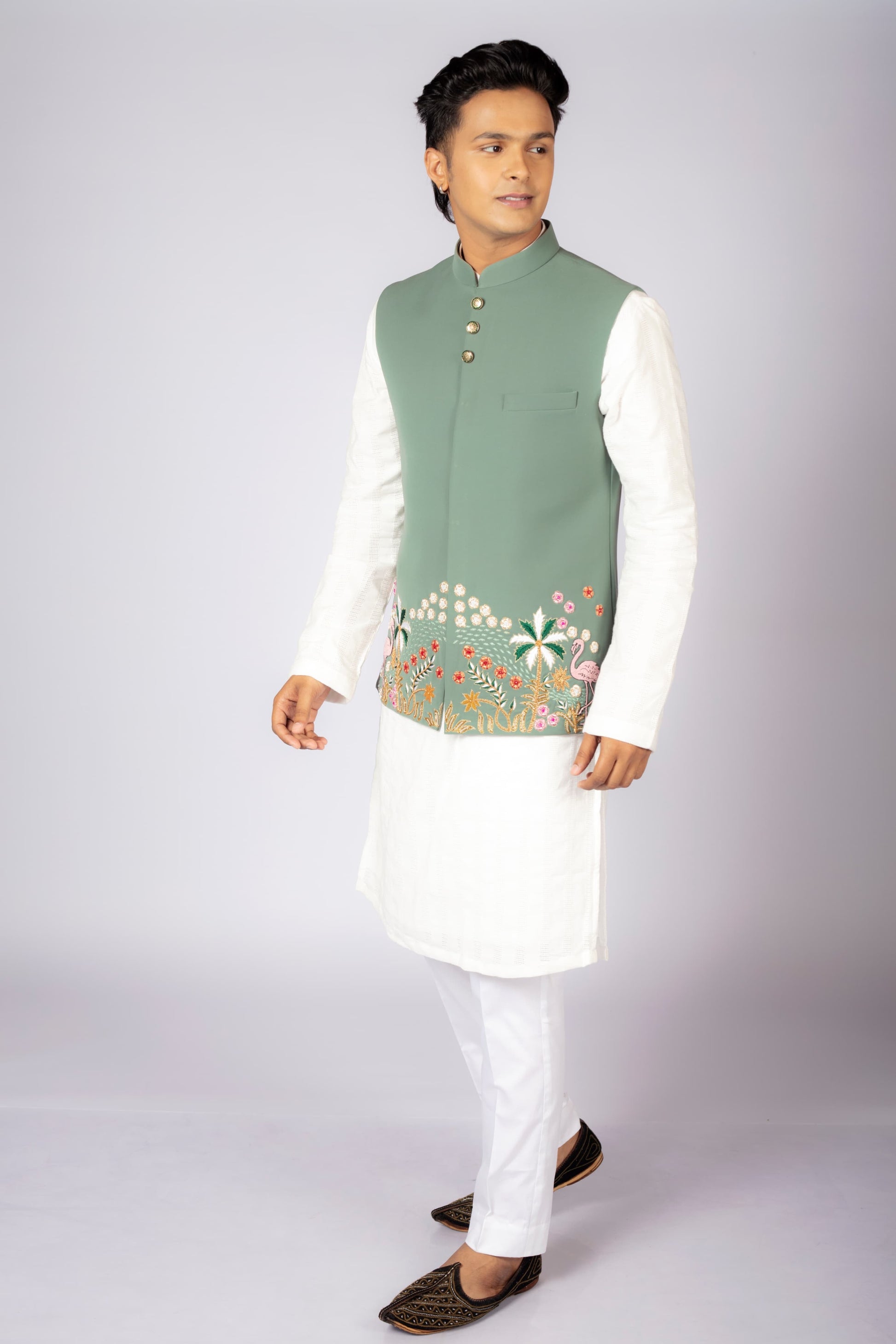 Step into timeless elegance with this beautifully crafted men's ethnic ensemble. Featuring a sage green Nehru jacketadorned with intricate multicolor floral embroidery, this set is a perfect blend of tradition and style. The jacket is paired with a classic white kurta and white churidar pants, offering a clean and sophisticated silhouette.