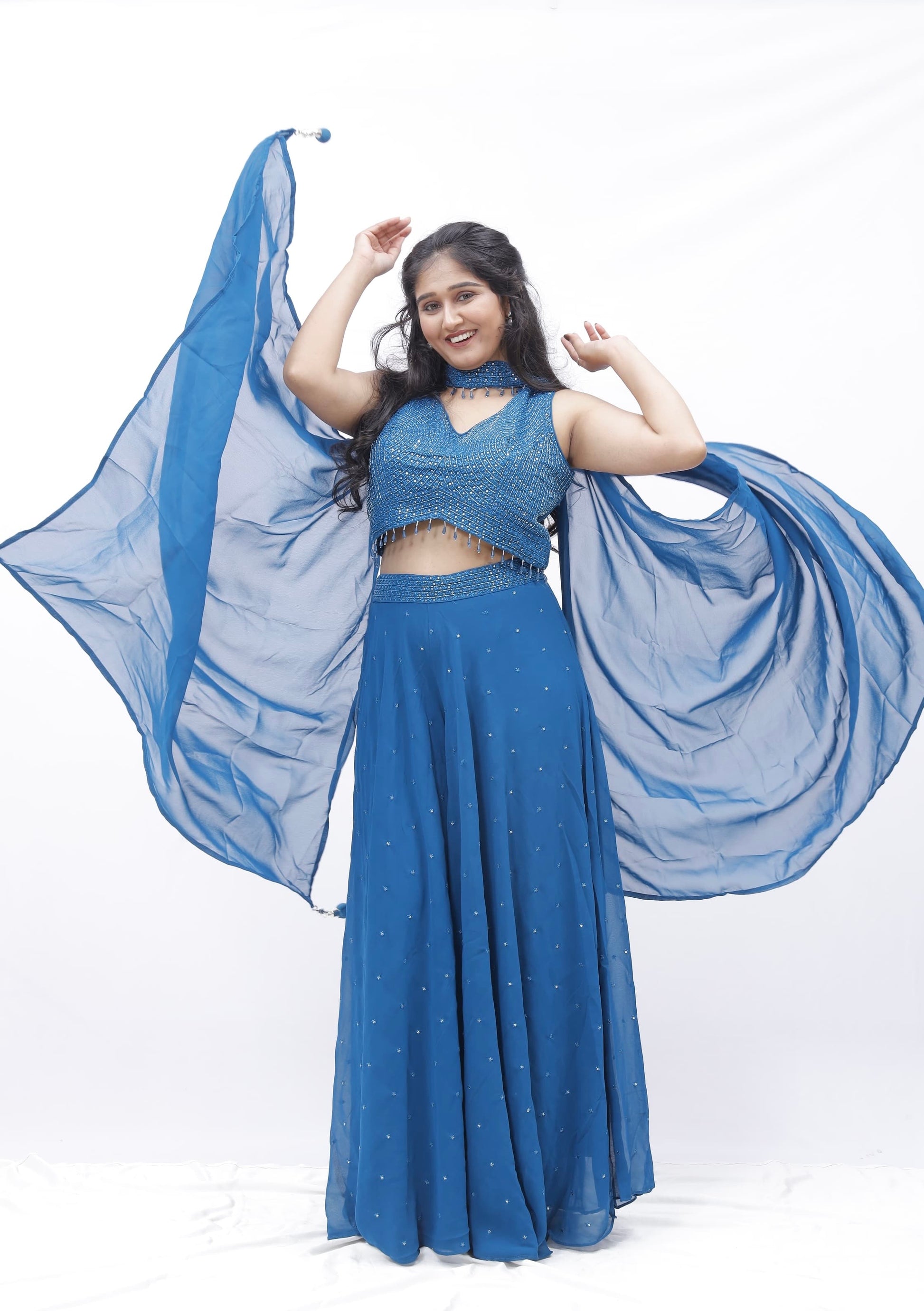 Make a statement with our Midnight Sparkle Indo-Western Set, a perfect fusion of modern glam and traditional elegance. This deep teal blue ensemble features a sleeveless draped blouse intricately adorned with sequin embroidery, adding a touch of shimmer with every move. The blouse is paired with a flowing georgette skirt detailed with delicate butti work that mirrors the celestial night sky.